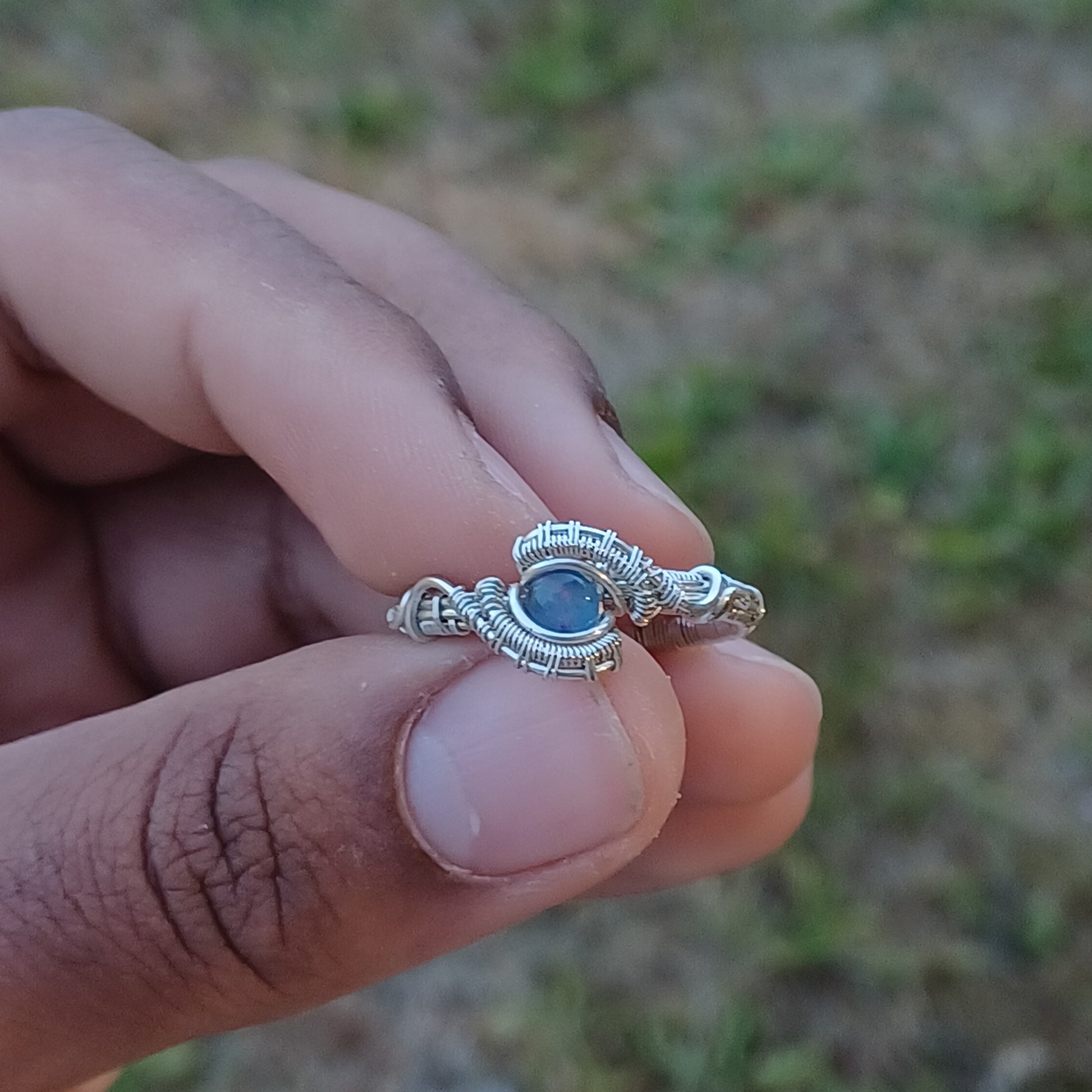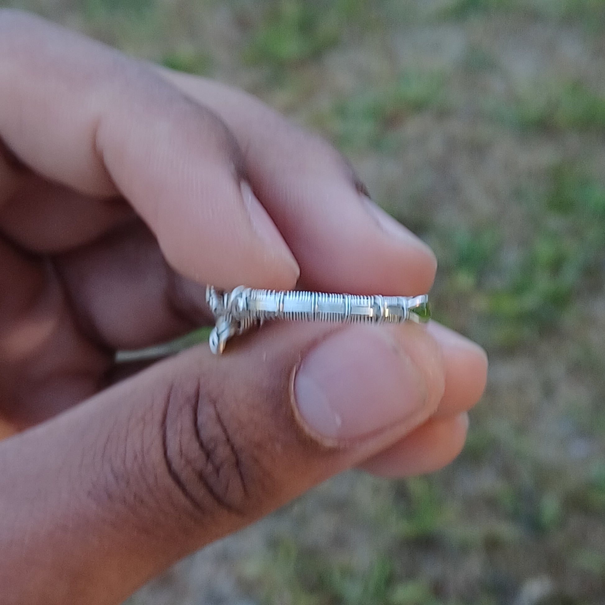 And Australian opal triplet wrapped in bright sterling silver wire with peridot accent stone in the bottom of the band.