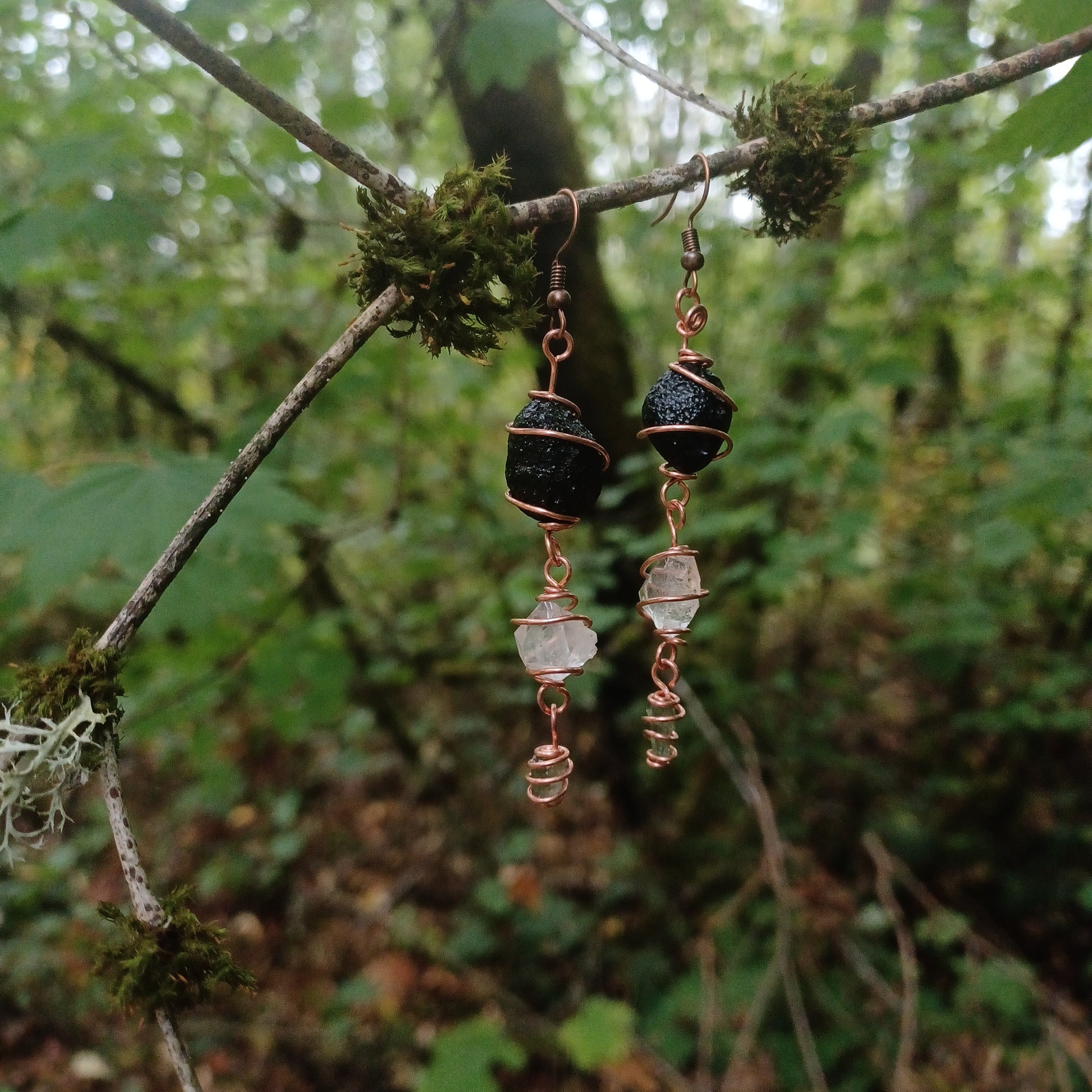 Indochinite-tektites, Herkimer Diamonds, and Moldavite chips wrapped in bare copper with hypoallergenic hooks. Comes with silicone earring backs.